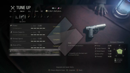 SG-09 R Power: Level 4: 1.80 (36,000 ptas) Level 5: 2.00 (51,000 ptas) Ammo Capacity: Level 4: 16 (9,000 ptas) Level 5: 18 (12,000 ptas) Reload Speed: Level 2: 1.10 (4,000 ptas) Level 4: 1.30 (9,000 ptas) Level 5: 1.40 (12,000 ptas) Rate of Fire: Level 2: 1.10 (7,000 ptas) Level 4: 1.33 (14,000 ptas) Level 5: 1.52 (18,000 ptas)