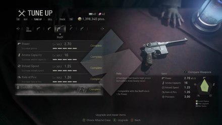 Red9 Power: Level 3: 2.10 (30,000 ptas) Level 4: 2.40 (45,000 ptas) Level 5: 2.70 (65,000 ptas) Ammo Capacity: Level 4: 14 (10,000 ptas) Level 5: 16 (12,000 ptas) Reload Speed: Level 4: 1.15 (11,000 ptas) Level 5: 1.25 (14,000 ptas) Rate of Fire: Level 4: 1.16 (14,000 ptas) Level 5: 1.26 (19,000 ptas)