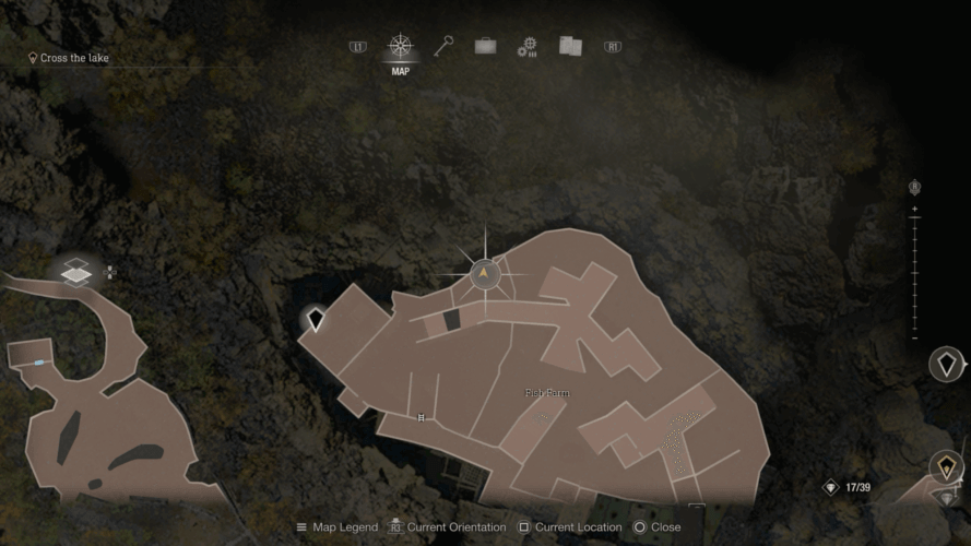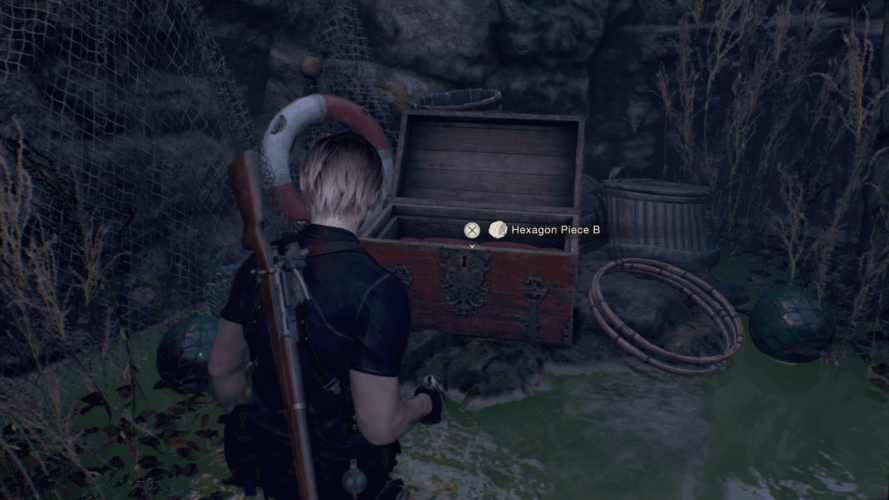 You can find Hexagon Piece B at the Fish Farm in Chapter 3, to the right of the house containing the Boat Fuel. You will have to enter the water and wade beneath a wooden bridge to reach the chest containing this puzzle piece.