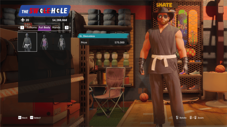 You can purchase Gi, Sleeveless in the Swole Hole shop found at the southern end of the East Flats. It costs $75,000, so make sure to have the Cash ready before heading to the store's location.
