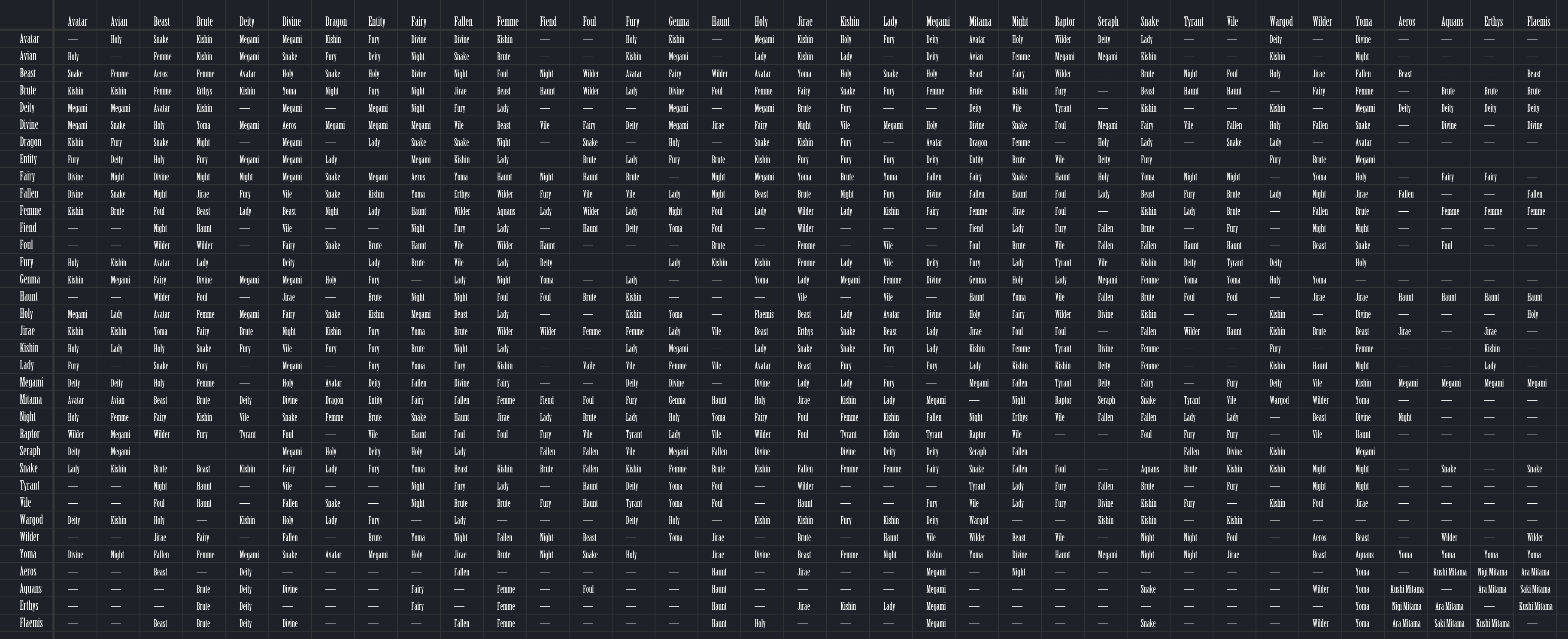 Fusing different races of Demons can result in a Demon of a completely different race than the two fused Demons. It is currently unknown what particular Demon combinations will result in which races, however, the above example of a Demon Chart from Shin Megami Tensei III may be useable to predict the result of Demon fusions to a degree.