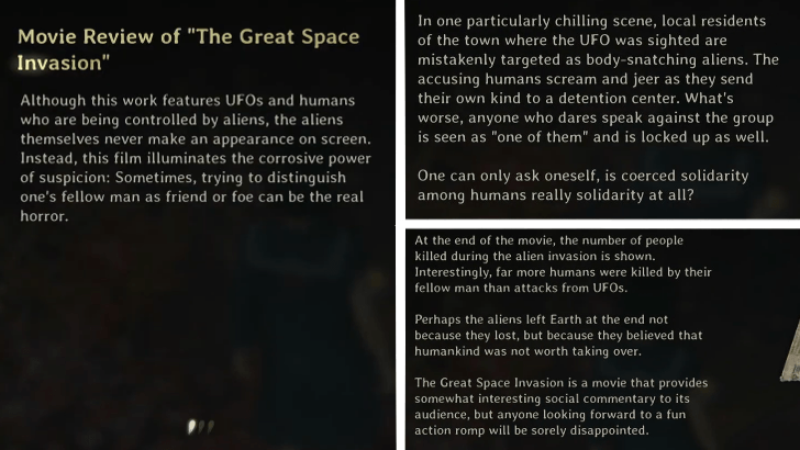 The Movie Review of The Great Space Invasion is one of the three key requirements for unlocking the UFO Ending, also known as The Great Space Invasion ending.