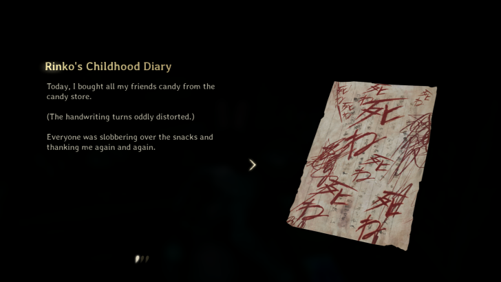 You can find this Rinko's Diary in the Chizuruya General Store area of the Dark Shrine Worship Hall. Picking the diary up will turn the room red.