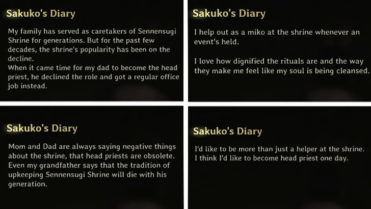 While doing the Door Puzzle, Sakuko's Diary can be encountered in the Dark Shine Worship Hall's eastern parts.