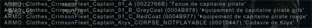 Pirate captain outfit : 0022766B Gray pirate captain gear : 0004B978 Red pirate captain gear : 0004B977 Pirate crew outfit : 0022766D Pirate Swashbuckler Gear : 0016D50B
