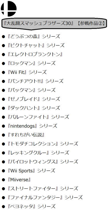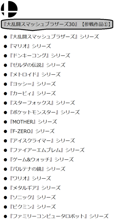 == 『大乱闘スマッシュブラザーズ30』【感想】 == 参戦作品(1)