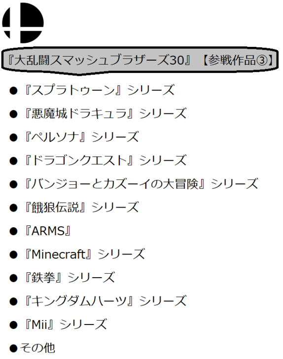== 『大乱闘スマッシュブラザーズ30』【感想】 == 参戦作品(3)
