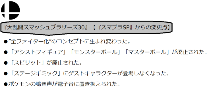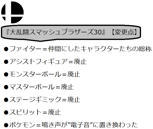== 『大乱闘スマッシュブラザーズ30』【『スマブラSP』からの変更点】 == ●“全ファイター化”のコンセプトに生まれ変わった。 ●「アシストフィギュア」「モンスターボール」「マスターボール」が廃止された。 ●「スピリット」が廃止された。 ●「ステージギミック」にゲストキャラクターが登場しなくなった。 ●ポケモンの鳴き声が電子音に置き換えられた。