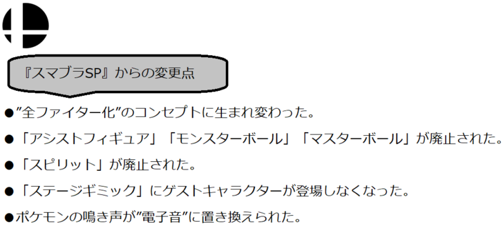 == 『スマブラSP』からの変更点 == ●“全ファイター化”のコンセプトに生まれ変わった。 ●「アシストフィギュア」「モンスターボール」「マスターボール」が廃止された。 ●「スピリット」が廃止された。 ●「ステージギミック」にゲストキャラクターが登場しなくなった。 ●ポケモンの鳴き声が電子音に置き換えられた。