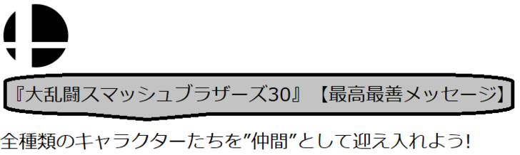 == 『大乱闘スマッシュブラザーズ30』【最高最善メッセージ】 == 『スマブラ』は30周年! 全種類のキャラクターたちを”仲間”として迎え入れよう!