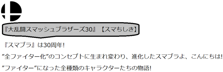 == 『大乱闘スマッシュブラザーズ30』【スマちしき】 == 『スマブラ』は30周年! ”全ファイター化”のコンセプトに生まれ変わり、進化したスマブラよ、こんにちは! ”ファイター”になった全種類のキャラクターたちの物語!
