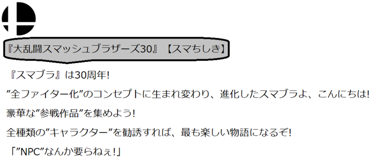 == 『大乱闘スマッシュブラザーズ30』【スマちしき】 == 『スマブラ』は30周年! ”全ファイター化”のコンセプトに生まれ変わり、進化したスマブラよ、こんにちは! 豪華な”参戦作品”を集めよう! 全種類の”キャラクター”を勧誘すれば、最も楽しい物語になるぞ! 「”NPC”なんか要らねぇ!」