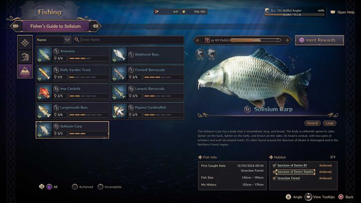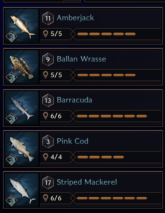 Ocean: [Part1] Amberjack: Kastleton, Windhill Shores, Blackhowl Plains, Laslan Coast, Daybreak Shore. Ballan Wrasse: Kastleton, Windhill Shores, BlackHowl Plains, Daybreak Shore, Laslan Shore. Barracuda: Vienta Village, Akidu Valley, Watcher's Post, Fonos Basin, Stonegard Coast. Pink Cod: Kastleton, Windhill Shores, Blackhowl Plains, Daybreak Shore. Striped Mackerel: Vienta Village, Akidu Valley, Watcher's Post, Fonos Basin, Stonegard Coast.
