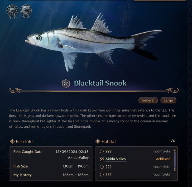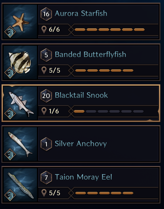 Ocean: [Part2] Aurora Starfish: Vienta Village, Akidu Valley, Watcher's Post, Fonos Basin, Stonegard Coast. Banded Butterflyfish: Kastleton, Windhill Shores, BlackHowl Plains, Daybreak Shore, Laslan Shore. Blacktail Snook: [Vienta Village]*,[ Akidu Valley]*, Watcher's Post, [Fonos Basin]*, [Stonegard Coast]*. Taion Moray Eel: Kastleton, Windhill Shores, BlackHowl Plains, Daybreak Shore, Laslan Shore. *Based on list of Habitat from other fish, only caught in Wacher's Post as lvl 20 fish.