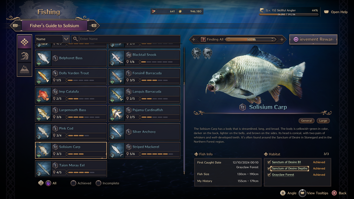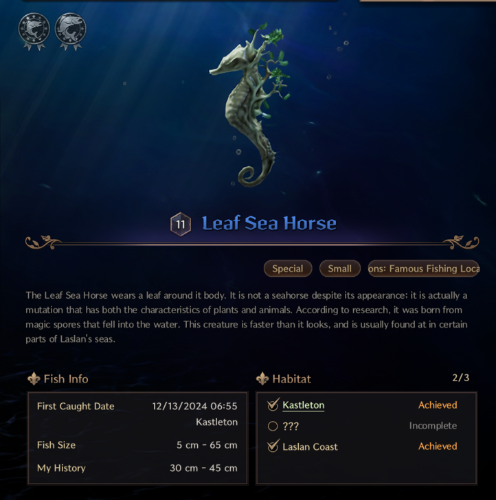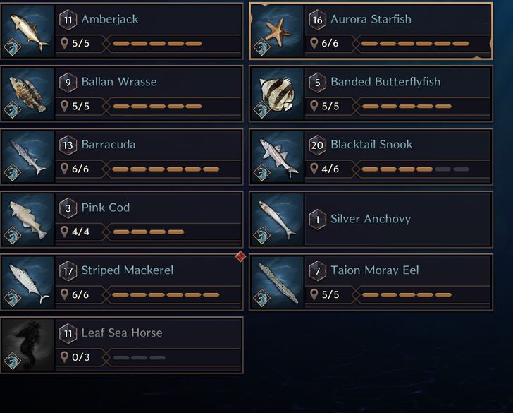 Seawater fish break into 2 groups - Note: Pink Cod is not in laslan Coast - Have not found Leaf Sea Horse yet Group 1: Amberjack, Ballan Wrasse, Banded Butterflyfish, Pink Cod and Taion Moray Eel. Found in: Kastleton, Windhill Shores, Blackhowl Plains, Daybreak Shore and Laslan Coast Group 2: Aurora Starfish, Barracuda, Blacktail Snook and Striped Mackerel Found in: Vienta Village, Akidu Valley, Watcher's Post, Fonos Basin, Saurodoma Island and Stronegard Coast