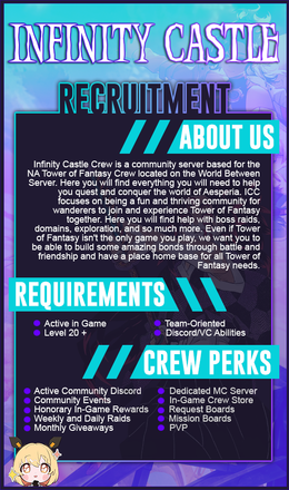 Crew Name: Infinity Castle Server: NA: The Worlds Between Crew Type: Casual/Competitive Crew Level: 2 About Infinity Castle: Infinity Castle Crew is a community crew based for the NA Tower of Fantasy Crew located on the World Between Server. Here you will find everything you will need to help you quest and conquer the world of Aesperia. ICC focuses on being a fun and thriving community for wanderers to join and experience Tower of Fantasy together. https://discord.gg/infinitycastle