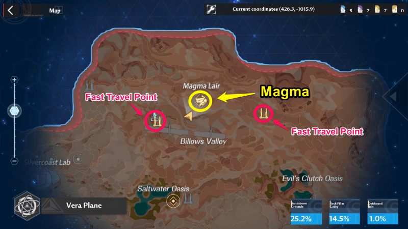 You can find Magma at the northernmost part of Rock Pillar Gobby, which is the northern section of Vera. Its boss stage is directly north Billows Valley and its closest fast travel points are Billows Valley East and Magma Lair.