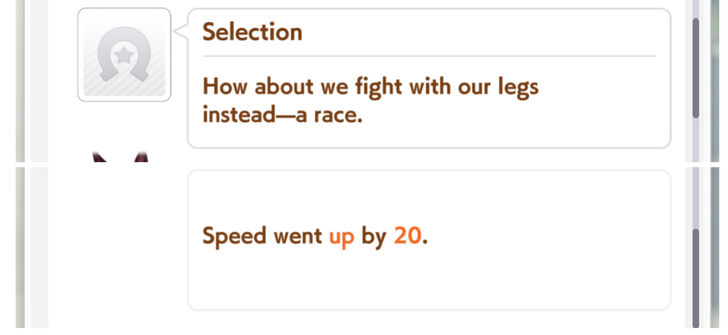 With the Makings of a Friend event, option one “How about we fight with our legs instead—a race.” Leads to speed going up by 20 points!