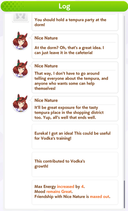 This support has a event (delicious burden),The second choice (you should hold a tempura party at the dorm) that increases max energy by 4 and increases mood.