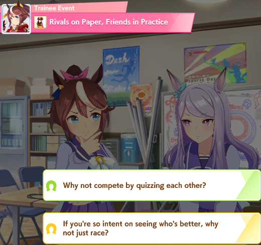 The "I Love Complicated Things!" Event The option "Let's see how fast it really is first" gives you 5 friendship and 1 hint level for Hesitant Front Runners as well which is not listed