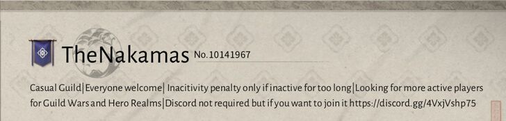 TheNakamas is a guild who strive to create a chill helping environment where everyone from different times can hang out and talk. We recently became a lvl 5 guild, sitting around 70+ members and are looking to fill even more. We are currently looking for active hero realm members and PVP members for guild wars.
