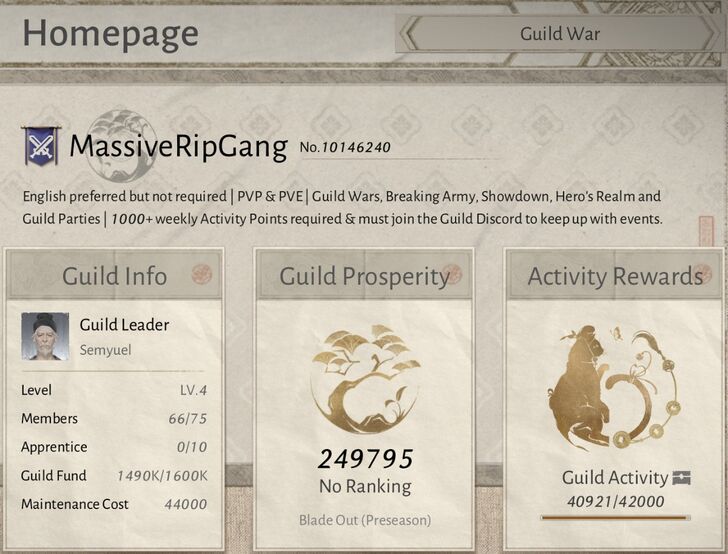 Looking for active players interested in guild events. We're a lvl 4 guild and are less than 5k EXP away from lvl 5. If you'd like to take part in Guild Wars, Breaking Army, Showdown, Hero's Realm and Guild Parties spread throughout the week, at times ranging from 7:30 - 10:30 pm EST, we are the guild for you. https://www.reddit.com/r/WWMRecruitment/comments/1qn2ici/na_massiveripgang_is_recruiting_pvp_pve_discord/