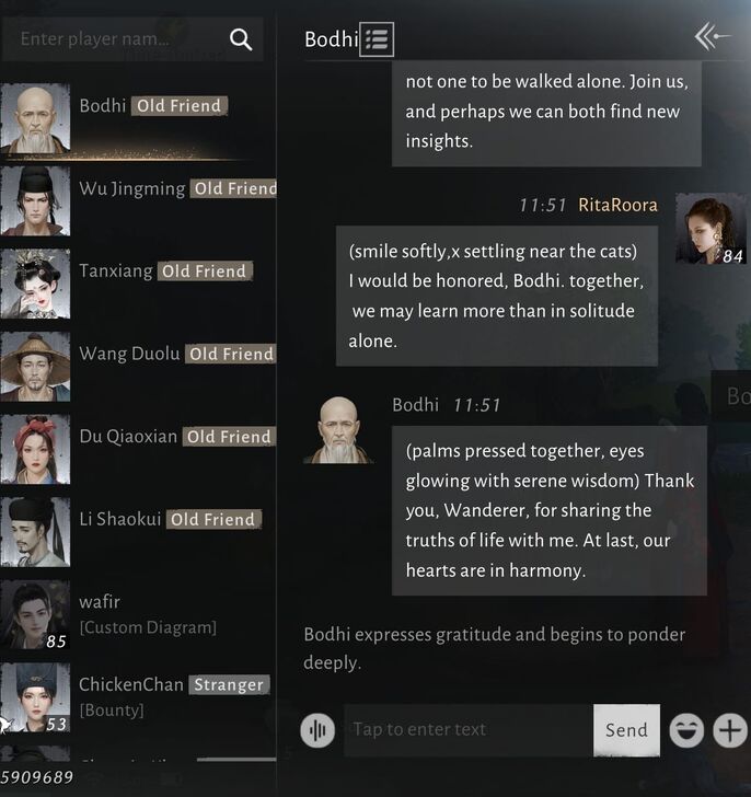 You may try my approach After Bodhi 1st line Wanderer : (Bow slightly, smiling softly) Bodhi… I have always loved cats. They teach patience and calm, much like solitary cultivation. I know a few ways to earn their trust, if you’d let me show. Wanderer : (Sit quietly, extending a hand slowly) Then may I join them, Bodhi… and learn their ways alongside you? Wanderer : (Smile softly, settling near the cats) I would be honored, Bodhi. Together, we may learn more than in solitude alone.