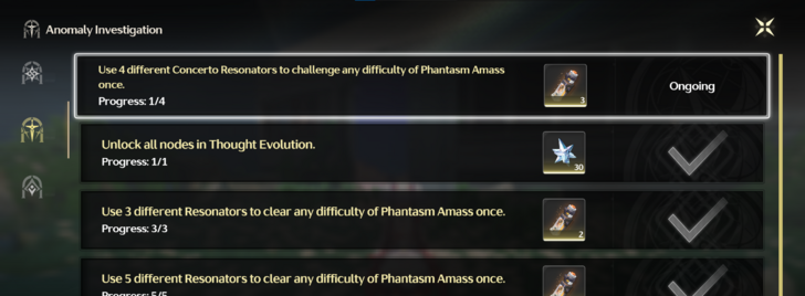 I cant figure out how to do the "Use 4 different concerto resonators to challenge any difficulty of Phantasm Amass once." when i enter any of the Phantasm Amass there no resonator to choose. mayb im just stpid.