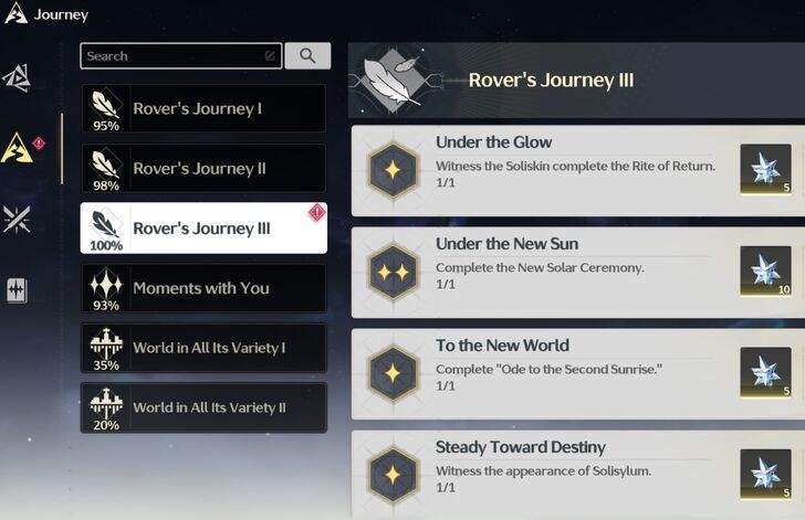 Missing an achievement Journey > Rover's Journey III > Under the Glow Missing an achievement Journey > Rover's Journey III > Under the New Sun Missing an achievement Journey > Rover's Journey III > To the New World Missing an achievement Journey > Rover's Journey III > Steady Toward Destiny