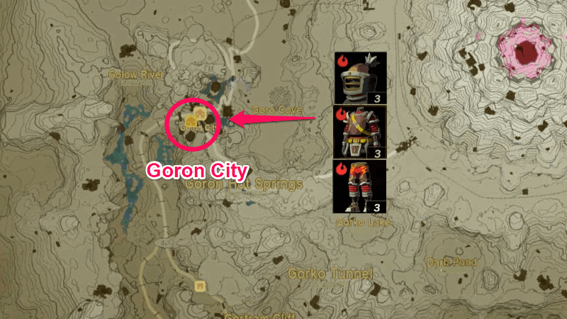 The Flamebreaker Armor can be purchased at the armor shop in Goron City with coordinates (1643, 2408, 0384) for 700 Rupees. Fast travel to Marakuguc Shrine and glide towards Goron City.