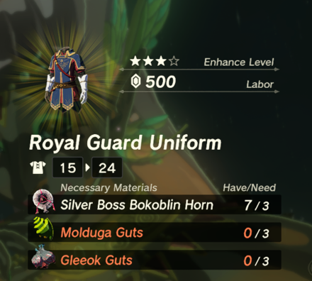 The upgrade materials for 4 stars is wrong. The correct materials are: - Silver Boss Bokoblin Horn x3 - Molduga Guts x3 - Gleeok Guts x3 - 500 Rupees All of the above is for 1 piece! X3 of them all to completely upgrade the set. BTW, Set bonus: Charge Atk. Stamina Up