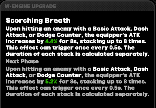 lvl 3 W-Engine refinement stats are 5.2% atk per stack.
