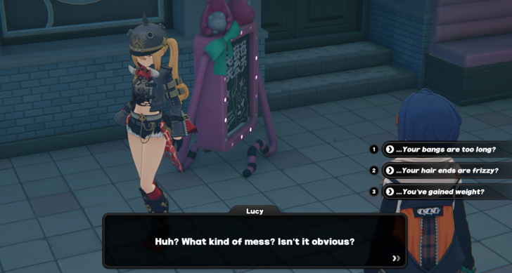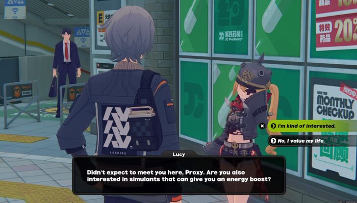 Random Event at JC Pharmacy. Lucy will if you're interested in buying energy supplements. Picking the prompt "I'm kinda of interested." will increase trust.