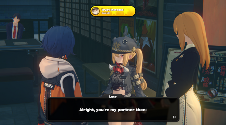 Lumina square - Close to officer mewmew (morning): "I'm kinda interested" gives trust increase