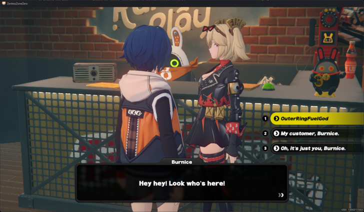 Burnice at Lumina street crossing She asked about if we like being called 'proxy' out on the street. replied to her " Please keep you voice down next time. " Trust increased.