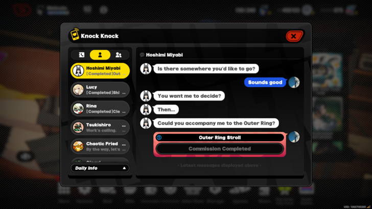Miyabi Invite: Outer Ring. The first option increases trust, and afterward, you gain additional significant trust.