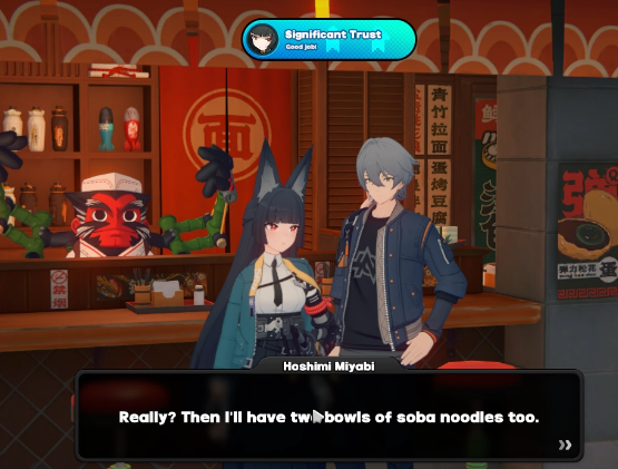 Encounter: Lumina Square Miyabi and Zhu Yuan outside of the 141 convenience store, choosing "Are you two arguing?" gives trust increase