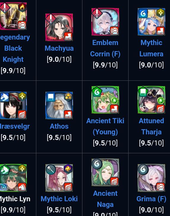 Thanks for the feedback. We are monitoring and testing the 9.9 heroes constantly to see if any of them are up for demotion. From the current list, we are eyeing Attuned Hector, Brave Felix, Freyr, Valentine's Edelgard, and Attuned Micaiah. Everyone else we feel still deserves their 9.9 rating.