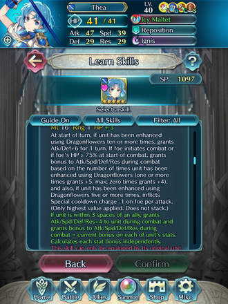 Build for Thea. +15 dragon flowers A: Atk/Def Unity B: Aerobatics 3 C: Spd/Res Menace Refined Icy Maltet (Status Refine that adds new weapon effects) Assist Skill: Reposition Special skill: Ignis The purpose of this build is to get Thea +14 Atk/Def and + 15 Spd/Res in most combats and it works in many situations. These stat buff give Thea bulk similar to many tanky heavy armor units while also giving her crazy attack and speed that units used for sweeping get.
