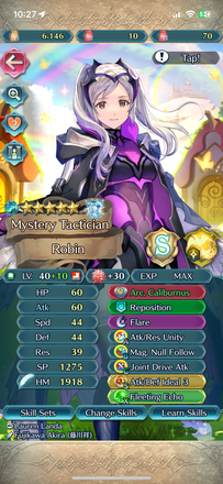 I would recommend giving it to either a character that you’ve built up (like F!Robin or S!Laevatein) or saving it for later, as there always could be a new grail unit that is green tome. Here’s my F!Robin i made just for the resplendent. I need a new A and C Skill, but overall, she does pretty good.