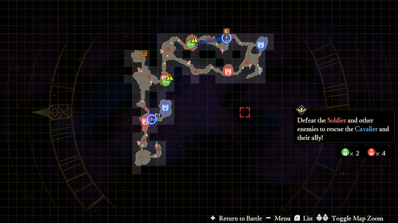 1. Defeat the Soldier and other enemies to rescue the Cavalier and their ally. 2. Defeat the Brigand and claim victory! 3. Defeat the Soldier and other enemies to rescue the Cavalier and their ally! Side Objectives ・ Defeat the Thief targeting the chest! |