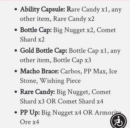 King’s Rock: 1) Life orb: 1 dynamax candy, 3 whishing piece 2) Dragon fang: 1 dynamax candy, 1 life orb, 2 repel 3) King’s rock: 1 dragon fang, 3 whishing piece
