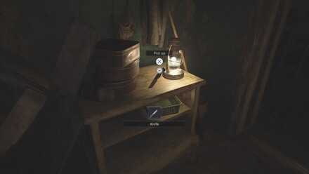 | 7 | Once inside the house with the lit brazier, pick up the knife from the table. You can use it to break the box with yellow stripes for a First Aid Med. |